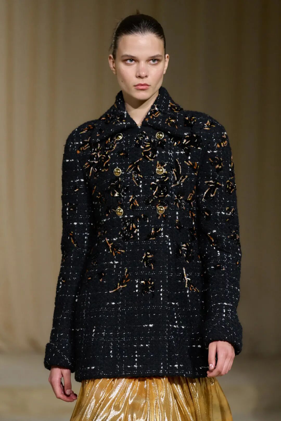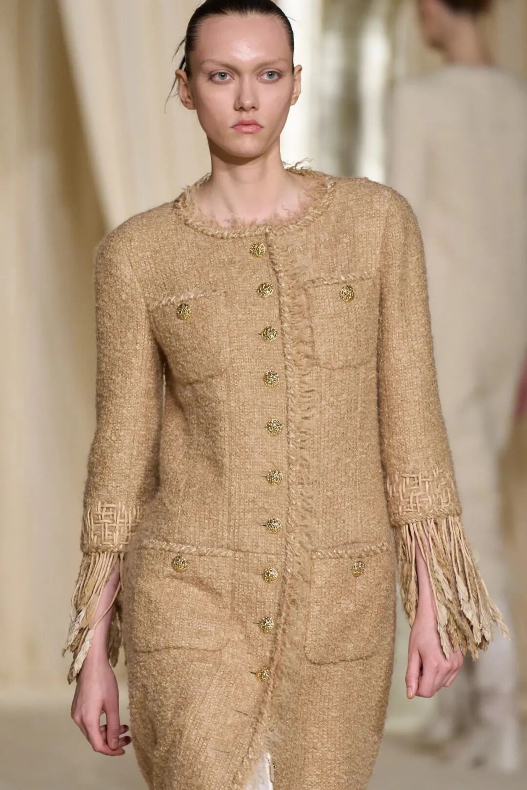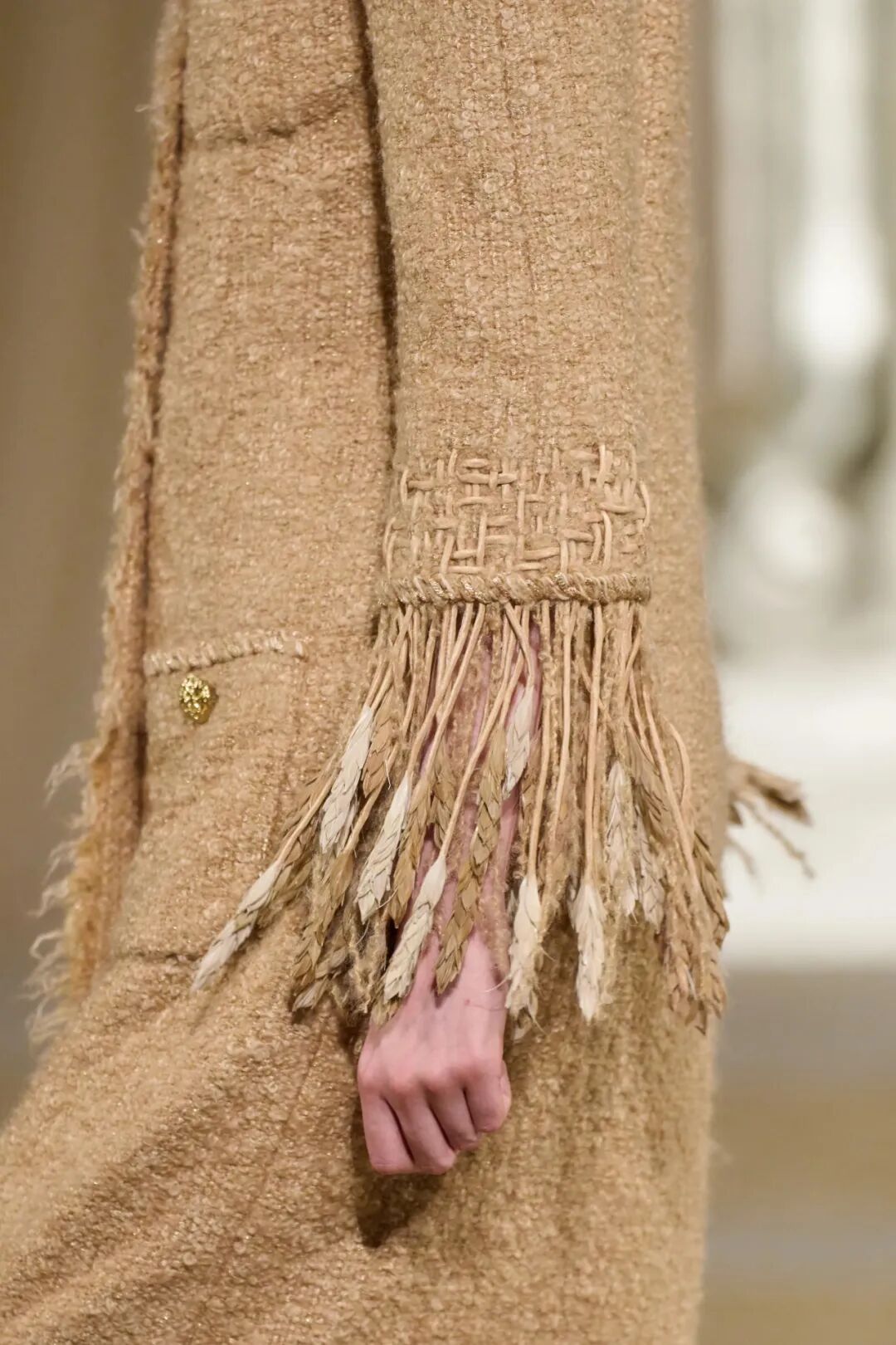 再靠近一點(diǎn),特別是在碩大的流蘇斗篷和裙擺中,麥穗以小米珠和金色串珠的形式不時“現(xiàn)身”,而在斜紋軟呢外套的緄邊上,織物縫線交叉穿梭的紋理,也被裝飾了一層麥穗般層疊的立體人字紋刺繡,就連各式各樣的珠寶鈕扣上,也浮現(xiàn)出麥穗的輪廓,盡顯手工坊的精湛工藝。