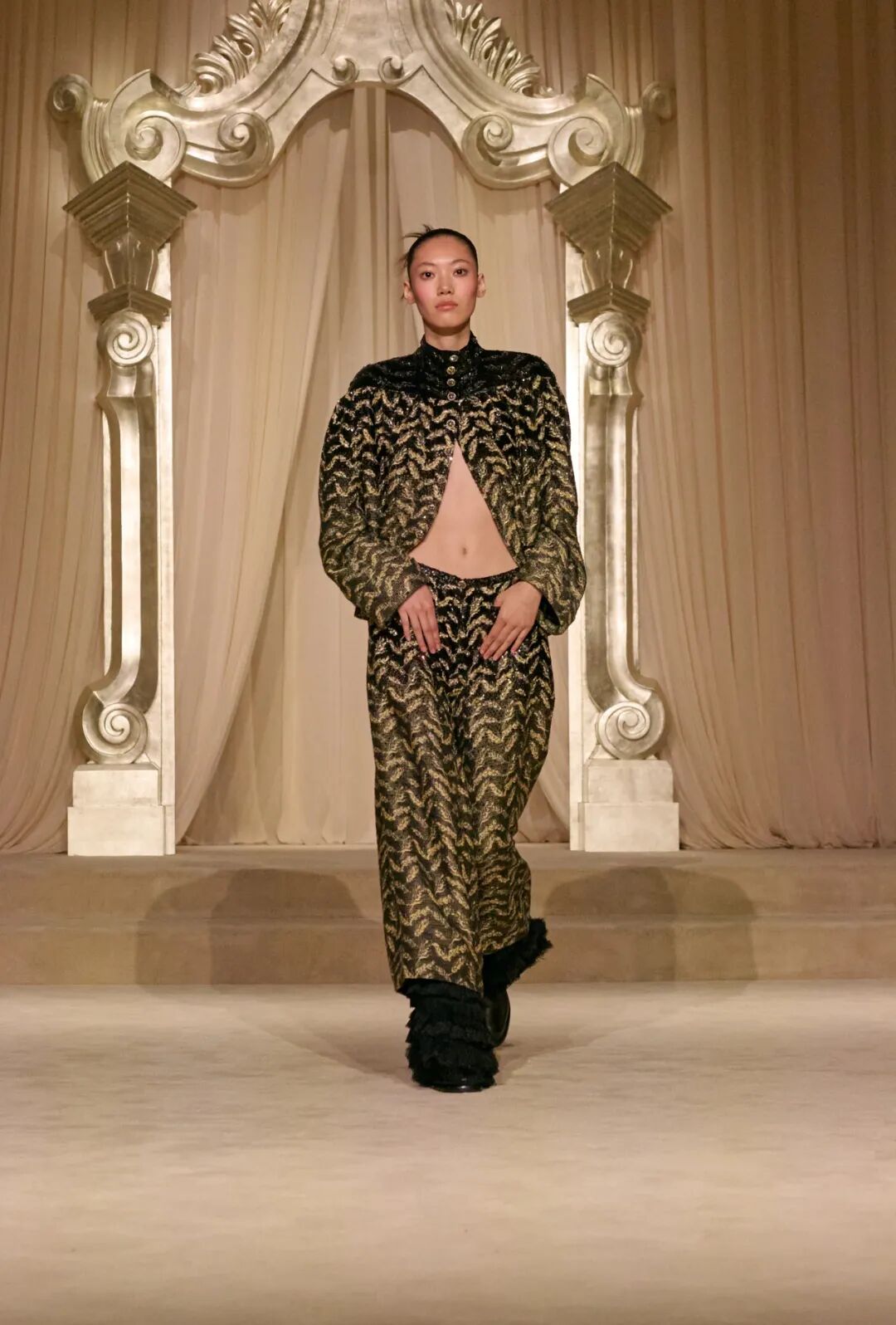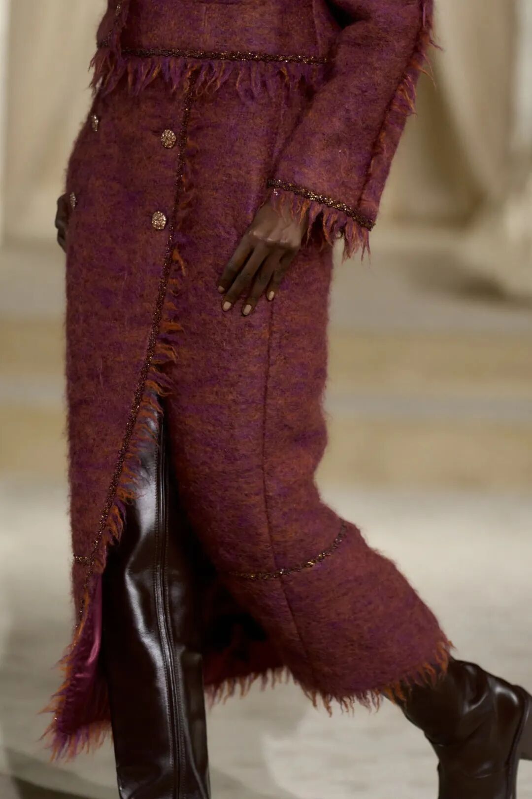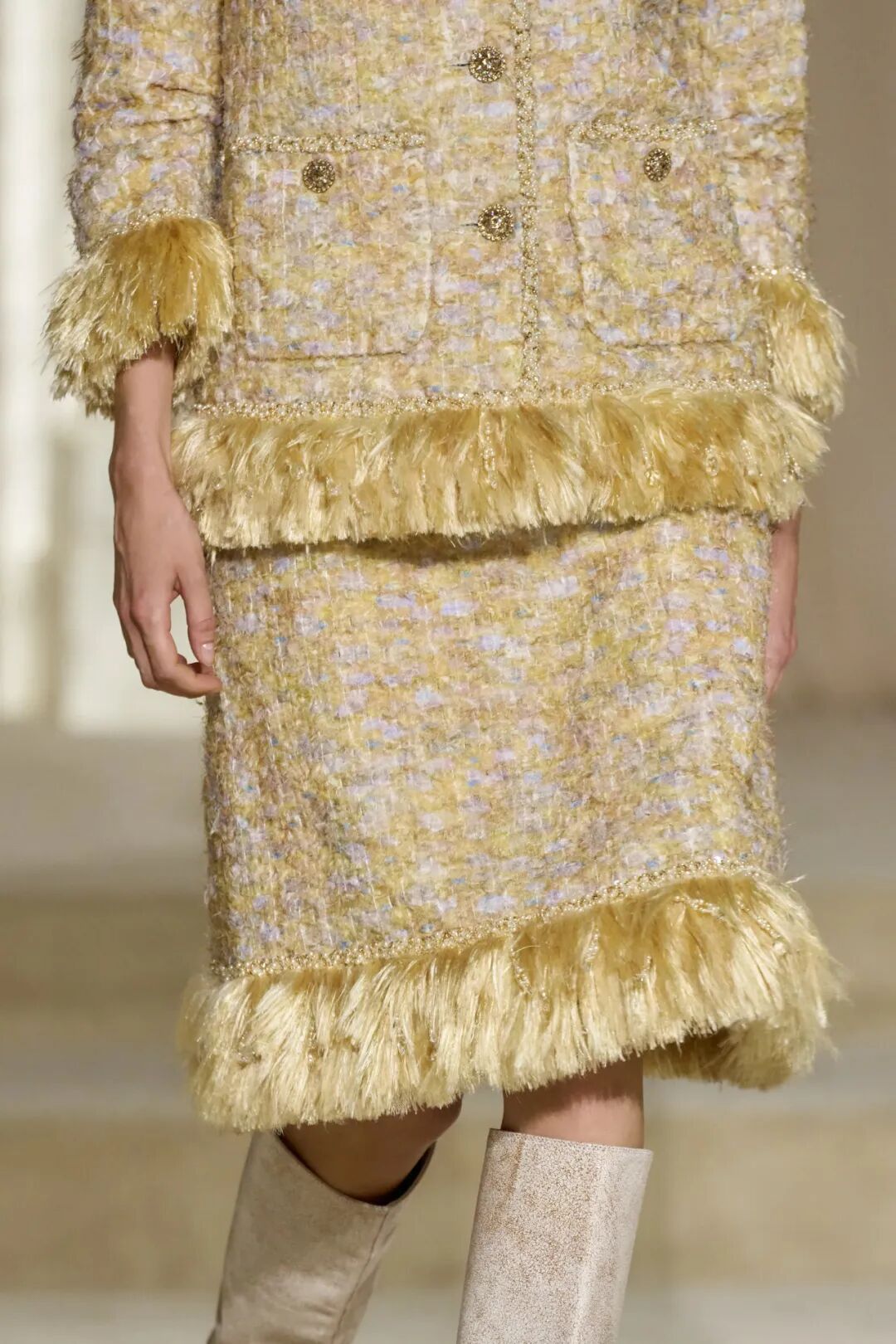 再靠近一點(diǎn),特別是在碩大的流蘇斗篷和裙擺中,麥穗以小米珠和金色串珠的形式不時“現(xiàn)身”,而在斜紋軟呢外套的緄邊上,織物縫線交叉穿梭的紋理,也被裝飾了一層麥穗般層疊的立體人字紋刺繡,就連各式各樣的珠寶鈕扣上,也浮現(xiàn)出麥穗的輪廓,盡顯手工坊的精湛工藝。