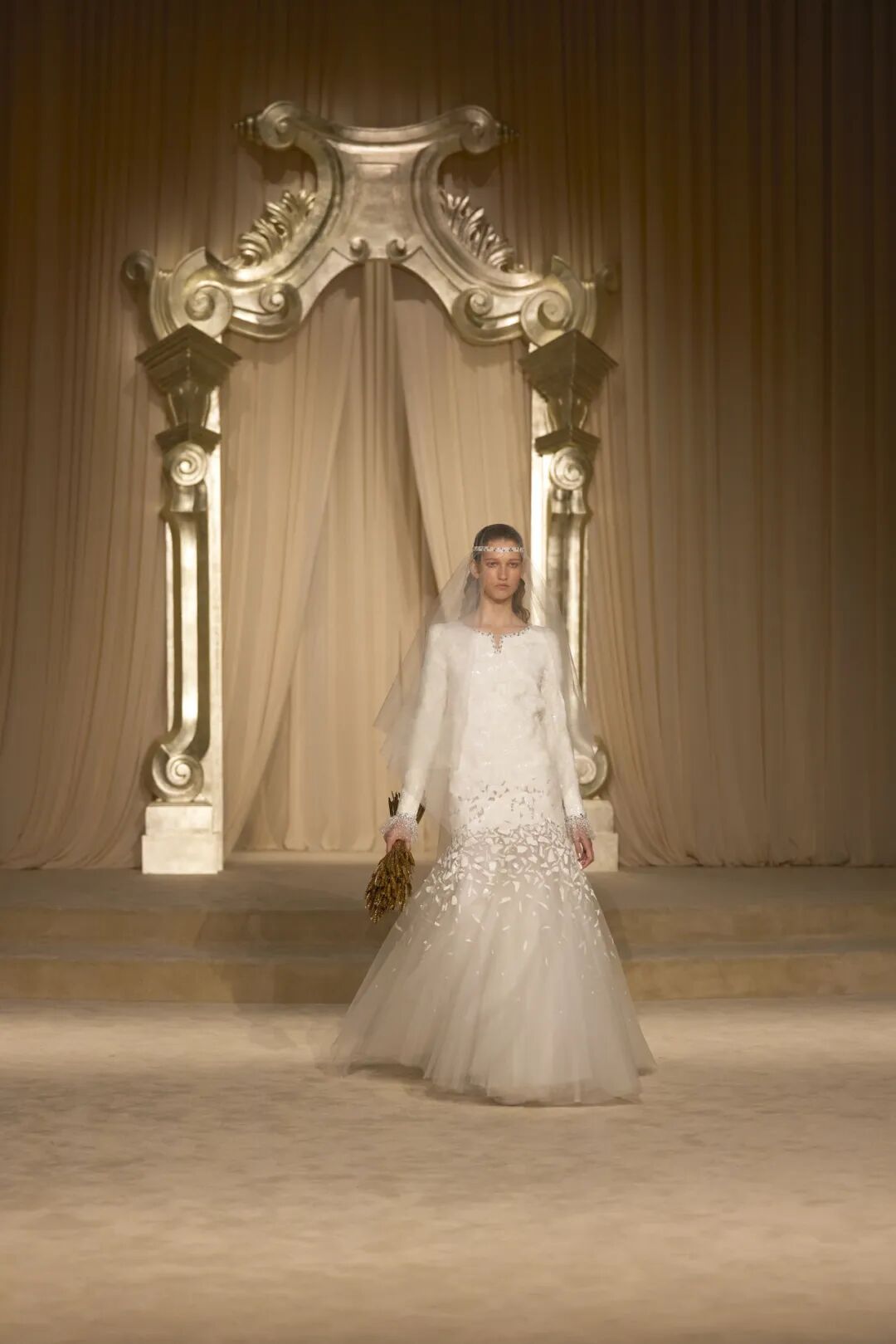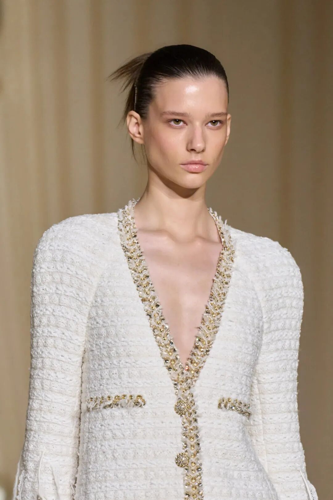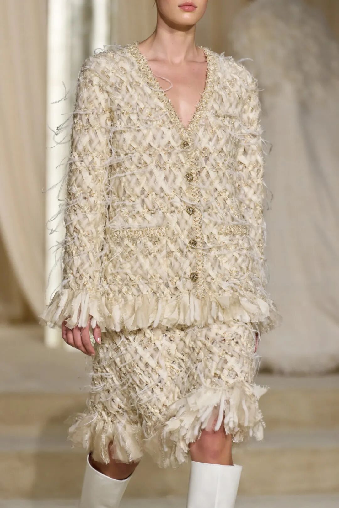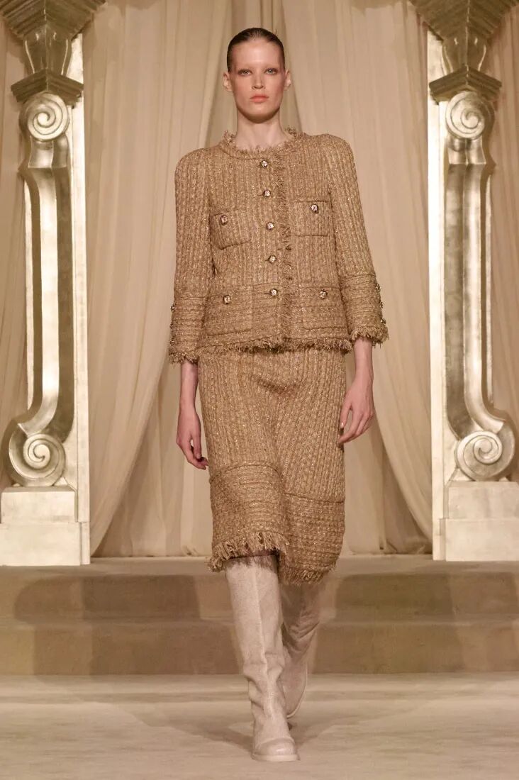 早在1960年代,CHANEL便推出過綴滿金色麥穗刺繡的高級定制服。而時至今日,精品部創(chuàng)意工作室選擇以現(xiàn)代而含蓄的手法,重新將麥穗的美好寓意帶回高級定制的創(chuàng)作世界。