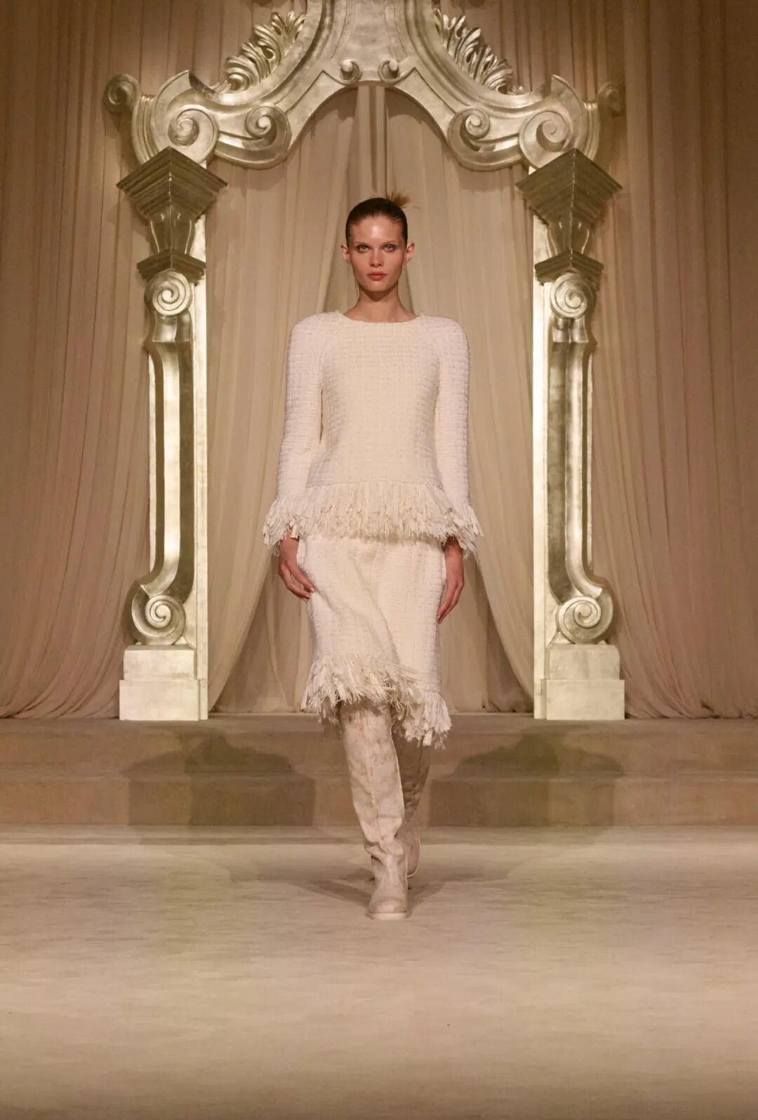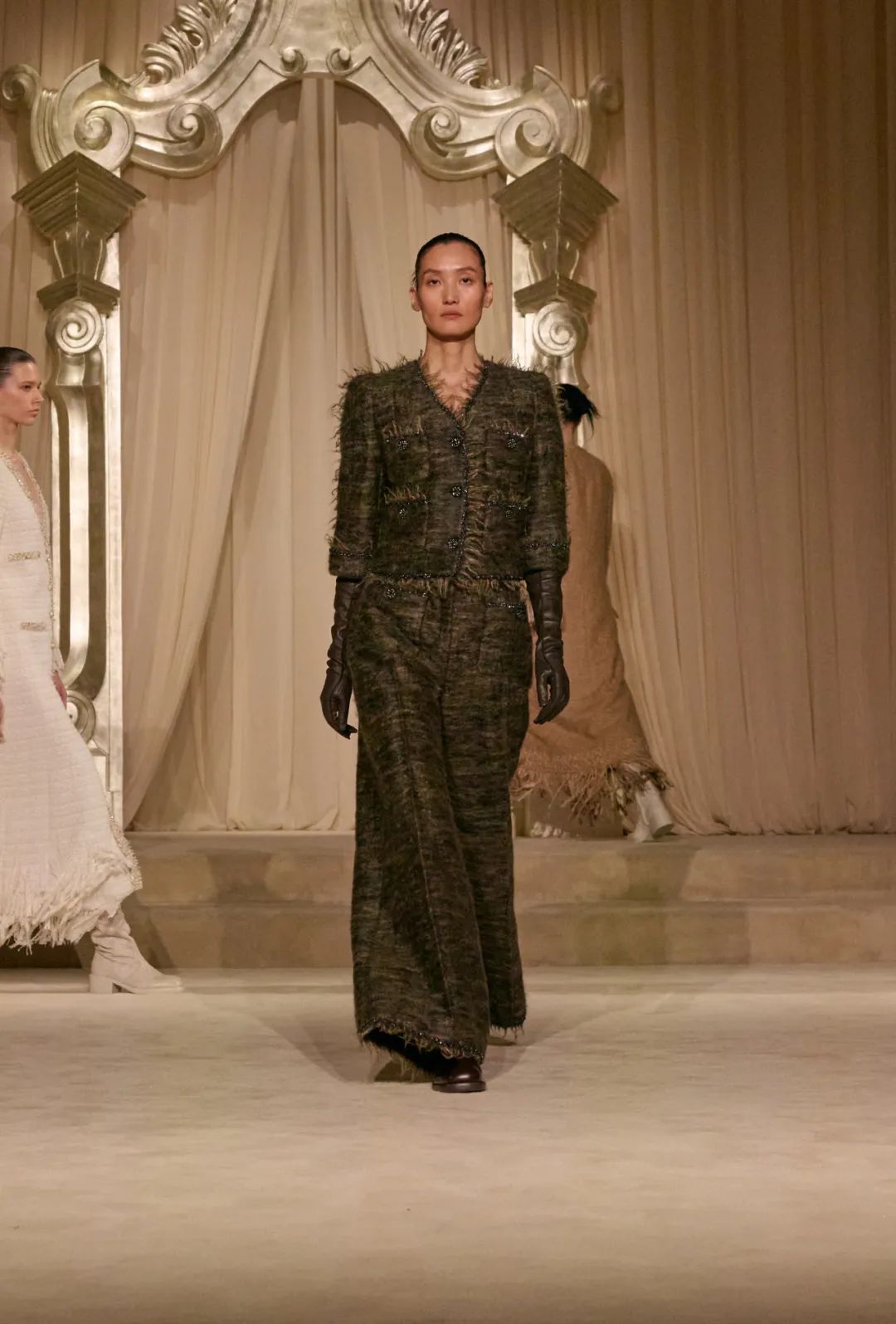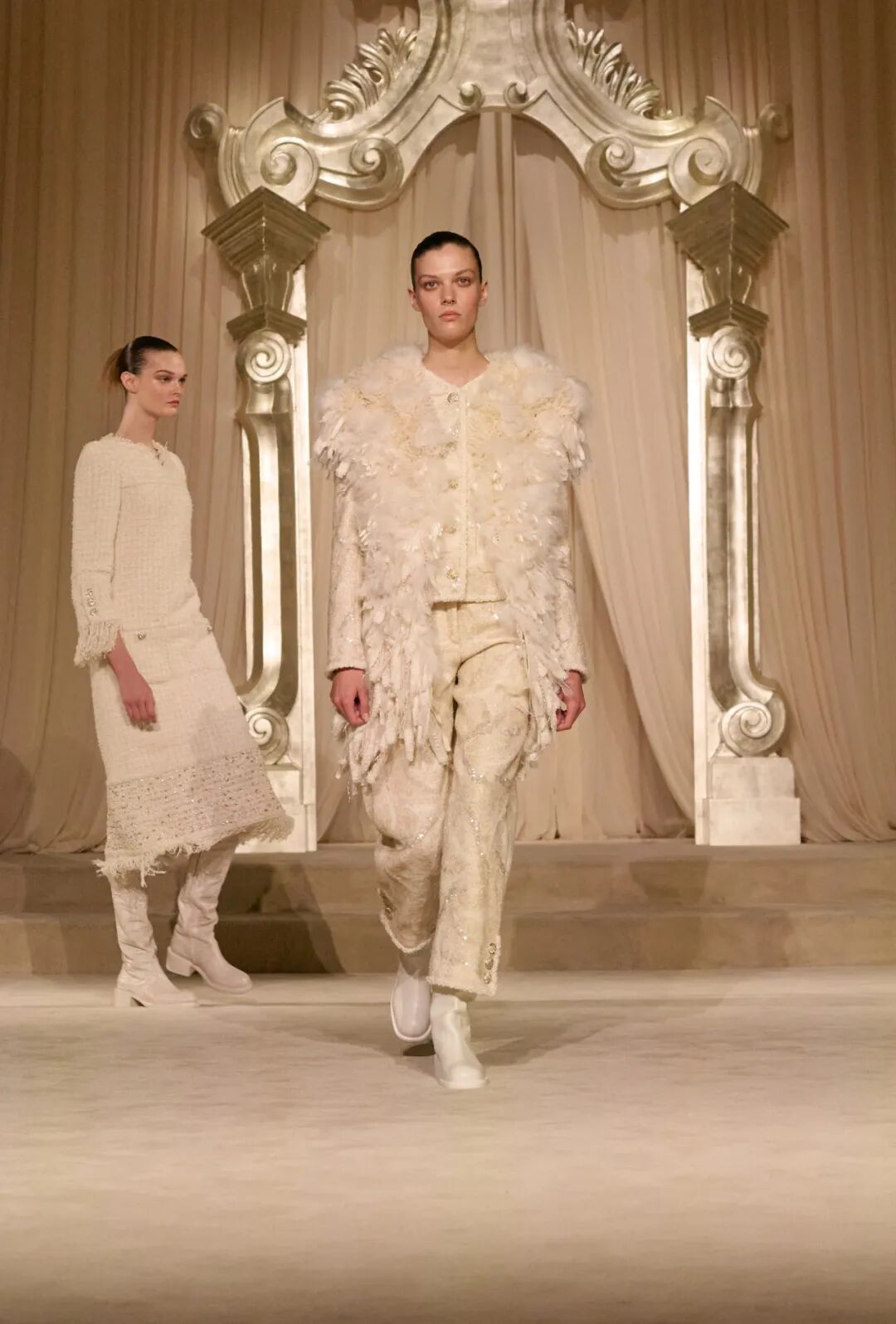 位于巴黎大皇宮榮譽(yù)廳(Salon d’Honneur)的本季秀場,曾是1900年世博會的核心展廳之一,占地上千平方米,如今卻鮮少出現(xiàn)在公共活動中?;蛟S這正是CHANEL選址在此的原因,既有歷史的厚重,又蘊(yùn)含如私人寓所般的神秘感。在設(shè)計(jì)師Willo Perron的構(gòu)思下,現(xiàn)場再現(xiàn)了康朋街31號的高級定制服沙龍,嘉賓們落座于沙龍同款的米色沙發(fā)中,等待新季高定的驚艷亮相。