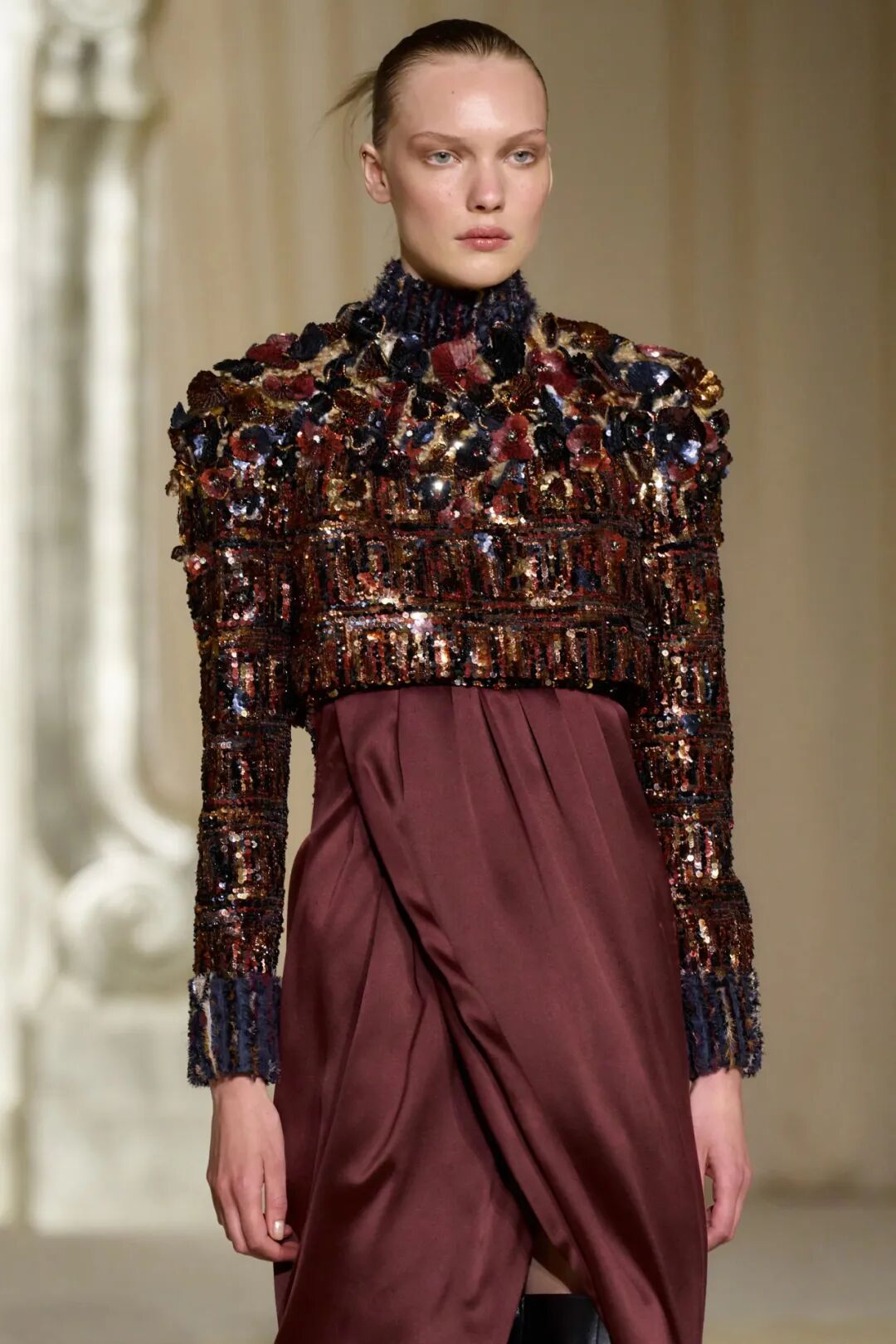 當(dāng)然,一抹棕色系的刺繡短外套與緞面裙裝的搭配,又會讓我們依稀聯(lián)想起烏木屏風(fēng)的美學(xué)意蘊(yùn),在高級定制服的世界中獲得了新的延續(xù)。