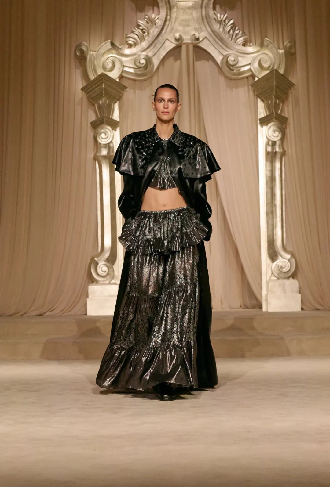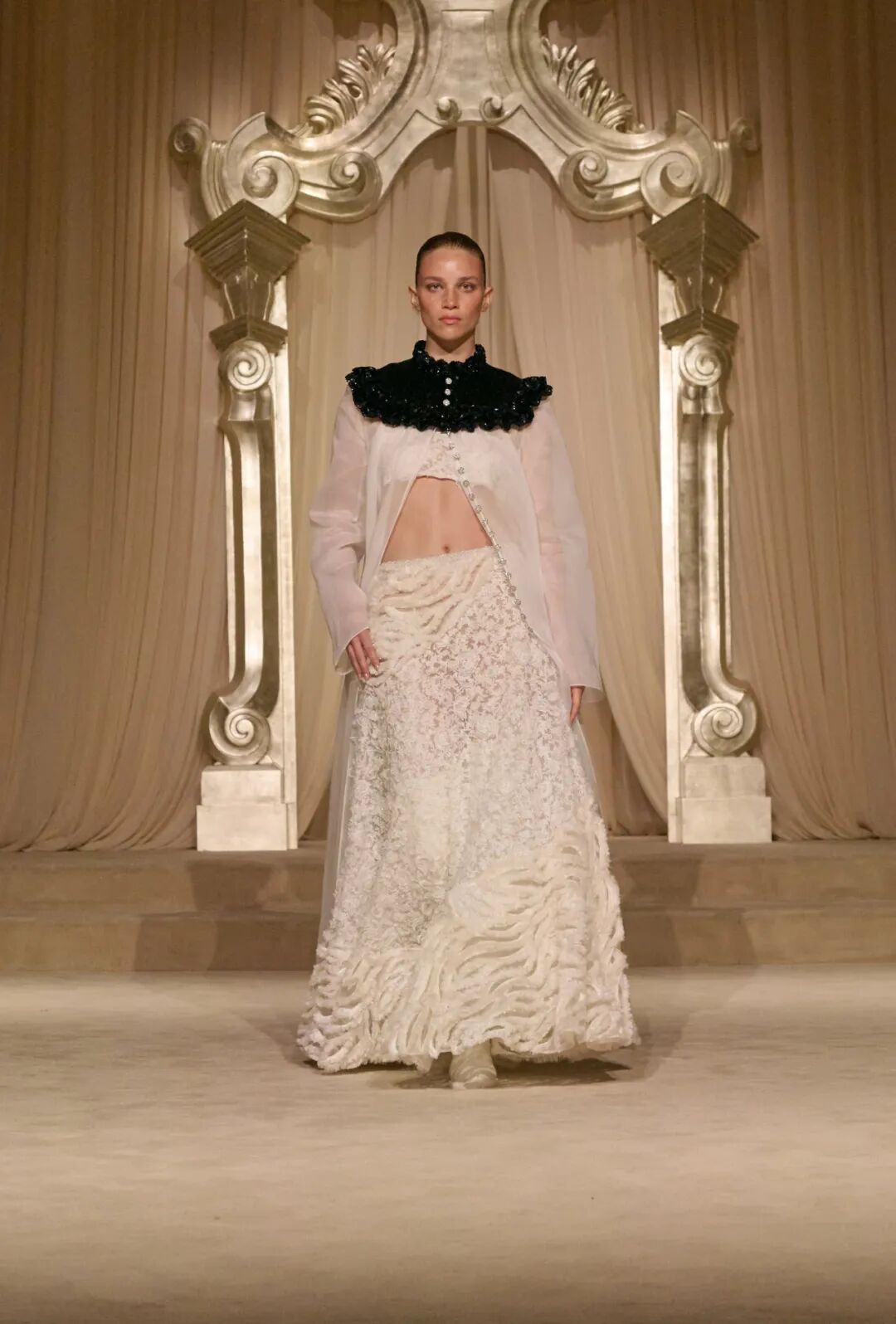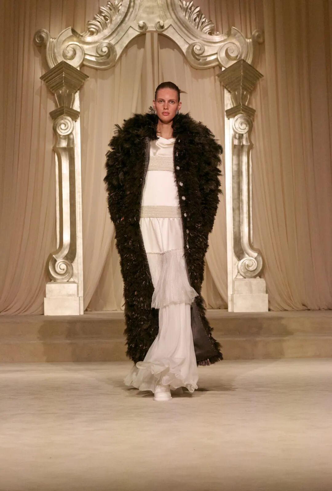 當(dāng)發(fā)布會臨近尾聲,一系列奢華的色彩再次被收斂起來,黑白雙色的對比重新占據(jù)主導(dǎo),無論是漸變的薄紗禮服裙,還是點(diǎn)綴在黑色外套與連衣裙上的、含苞待放的山茶花,似乎都在預(yù)示著風(fēng)格又一次輪回即將畫上休止符,屬于Matthieu Blazy的時代即將盛開。從色彩到裝飾細(xì)節(jié),各種歸于品牌創(chuàng)意原點(diǎn)的線索,為這場大秀的結(jié)尾拉滿了儀式感。