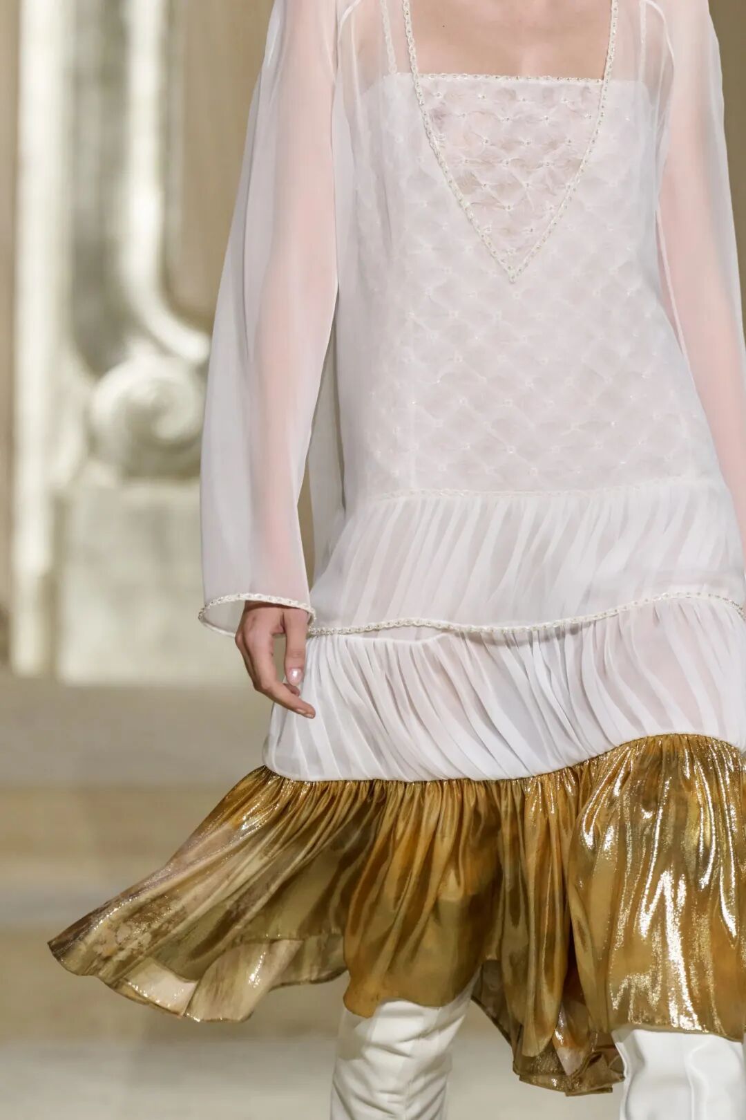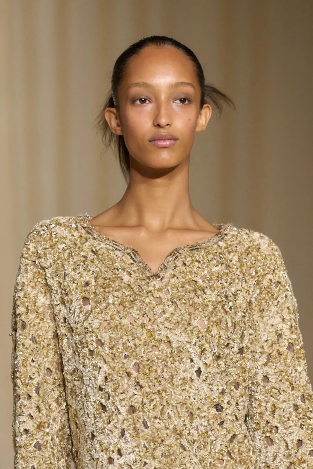 如果不是近距離觀察,你或許不會發(fā)現(xiàn),那些飄逸率性,隨著模特手臂擺動而上下飛舞的流蘇中,正隱藏著用皮革和羽毛打造出的麥穗。而顆顆分明的飽滿麥粒,則被工匠們以米色天鵝絨和金色亮片重塑,盤踞在透視連衣裙的薄紗之上,繁復(fù)卻輕盈靈動。