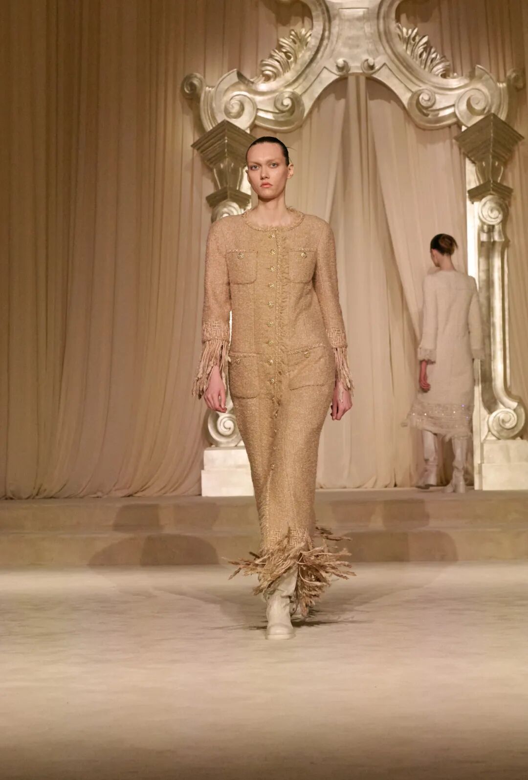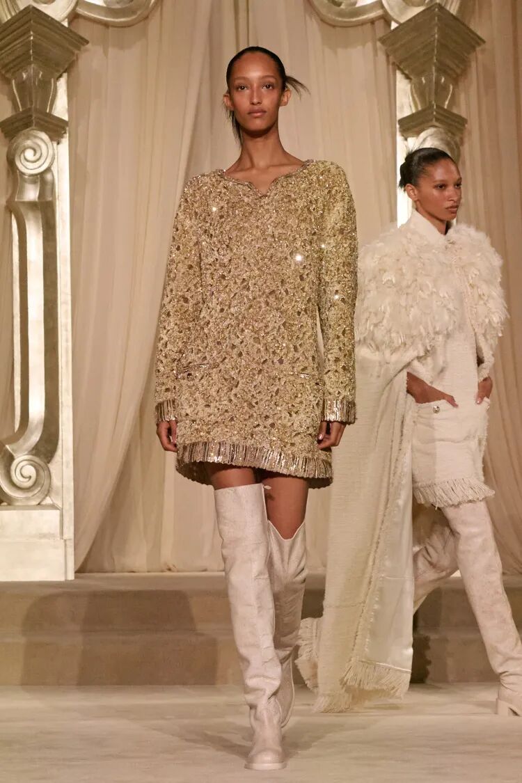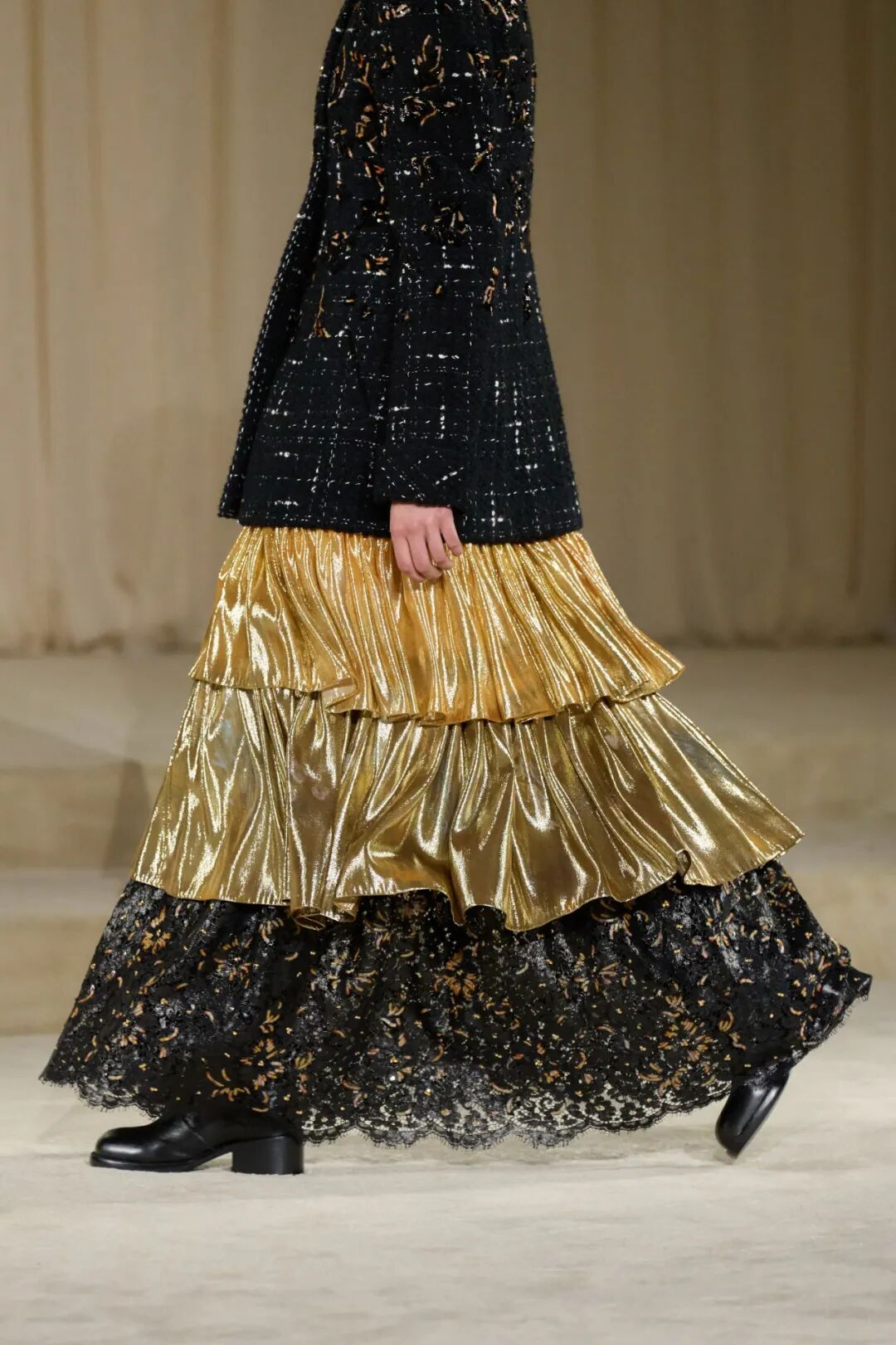 液態(tài)般細(xì)膩的金屬流光面料,化作裙擺之上的奢華點(diǎn)綴,以現(xiàn)代而輕盈的方式詮釋了寓所中和諧流動的金色雕花元素與金屬細(xì)節(jié)裝飾。從寓所到高定,香奈兒女士的美學(xué)視角被悄然解構(gòu)、融會貫通為一套和諧優(yōu)雅的創(chuàng)意語匯。