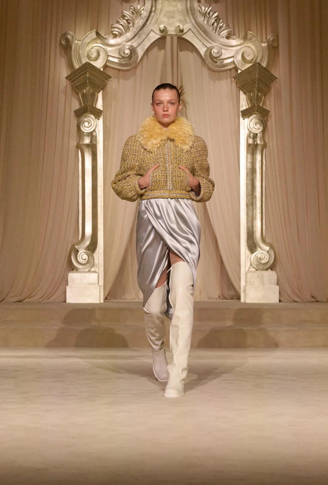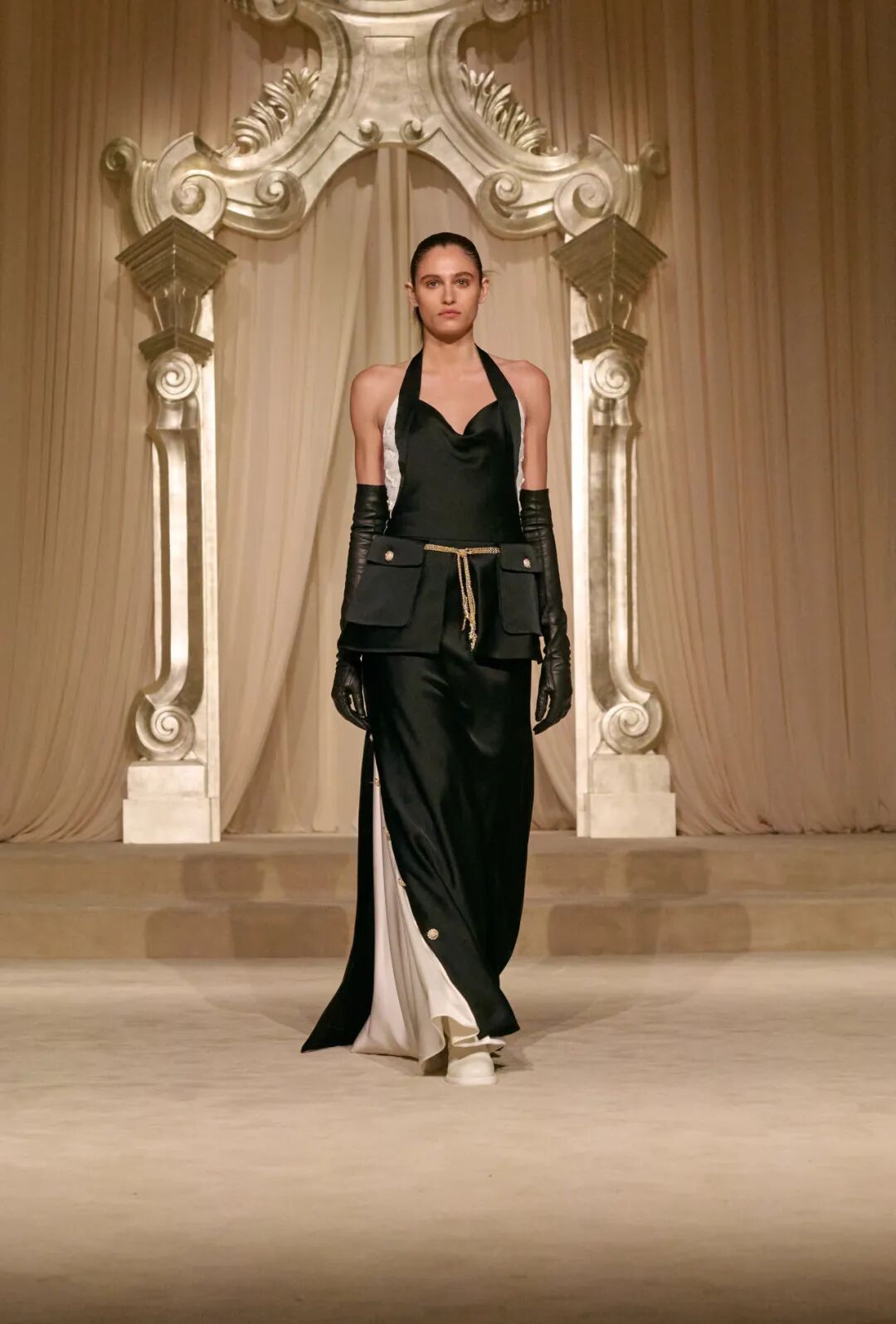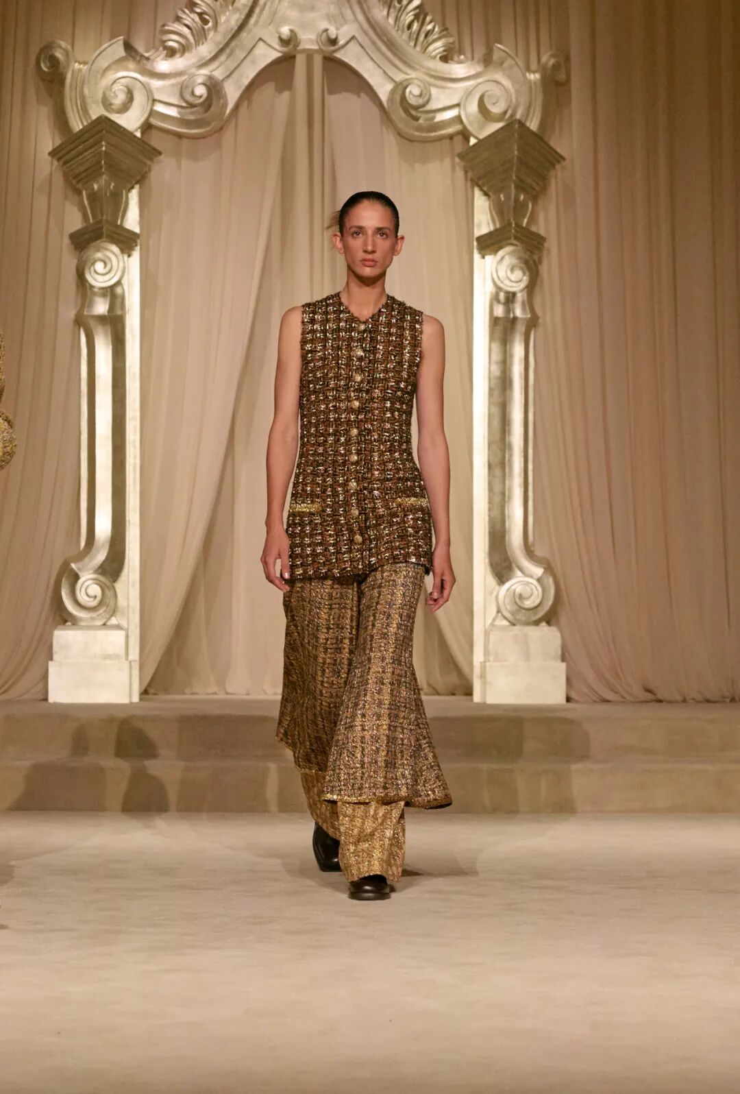 液態(tài)般細(xì)膩的金屬流光面料,化作裙擺之上的奢華點(diǎn)綴,以現(xiàn)代而輕盈的方式詮釋了寓所中和諧流動的金色雕花元素與金屬細(xì)節(jié)裝飾。從寓所到高定,香奈兒女士的美學(xué)視角被悄然解構(gòu)、融會貫通為一套和諧優(yōu)雅的創(chuàng)意語匯。