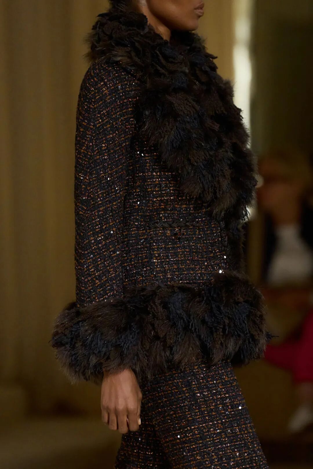 斜紋軟呢面料邊緣裝飾的絨毛飾邊,包括充滿流動感的緞面裙裝,呼應(yīng)著香奈兒女士生活中的休閑時刻,或許是斜倚在沙發(fā)旁,墊著抱枕閱讀的瞬間,亦或是依靠在窗簾帷幕后欣賞窗外景色的場景。